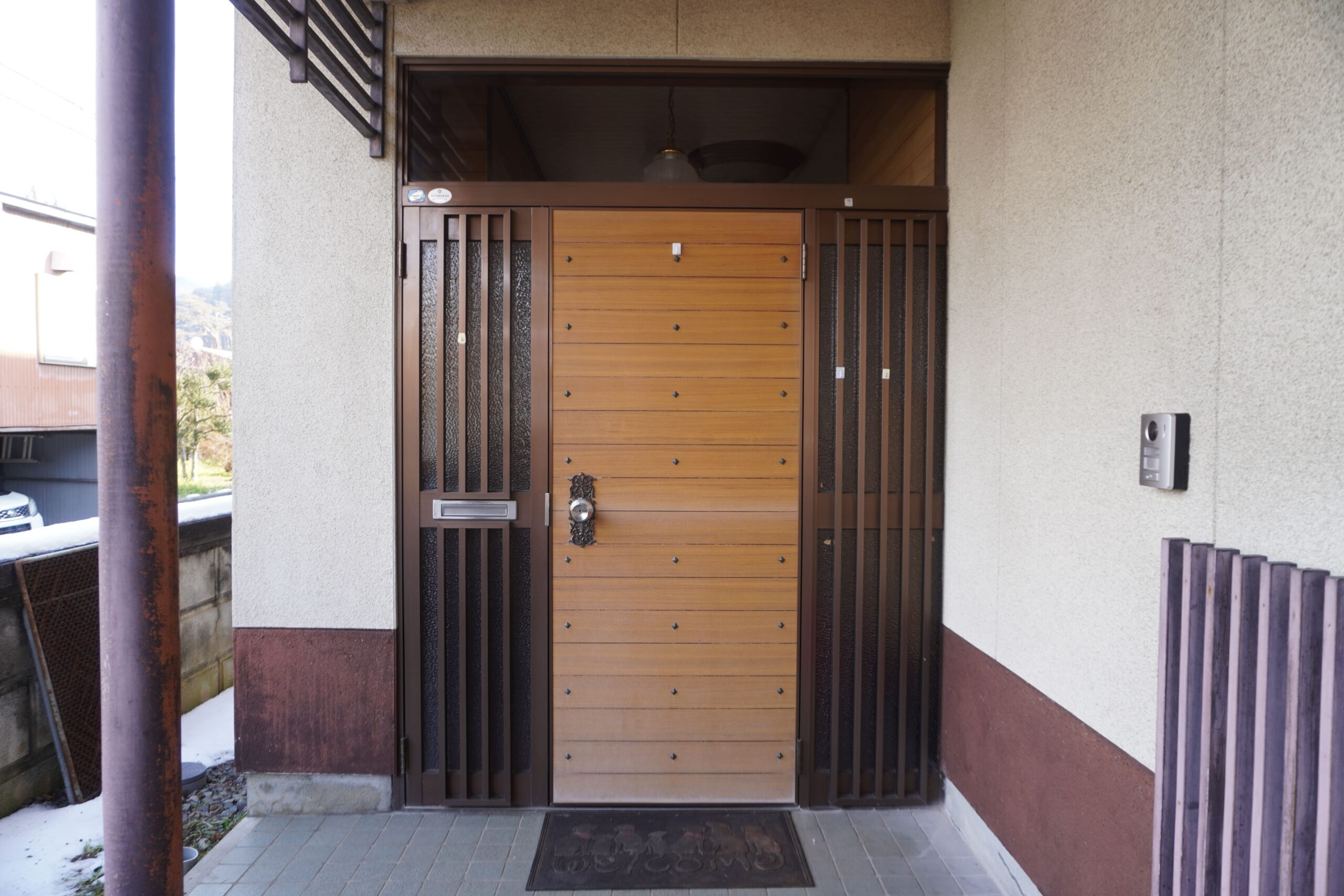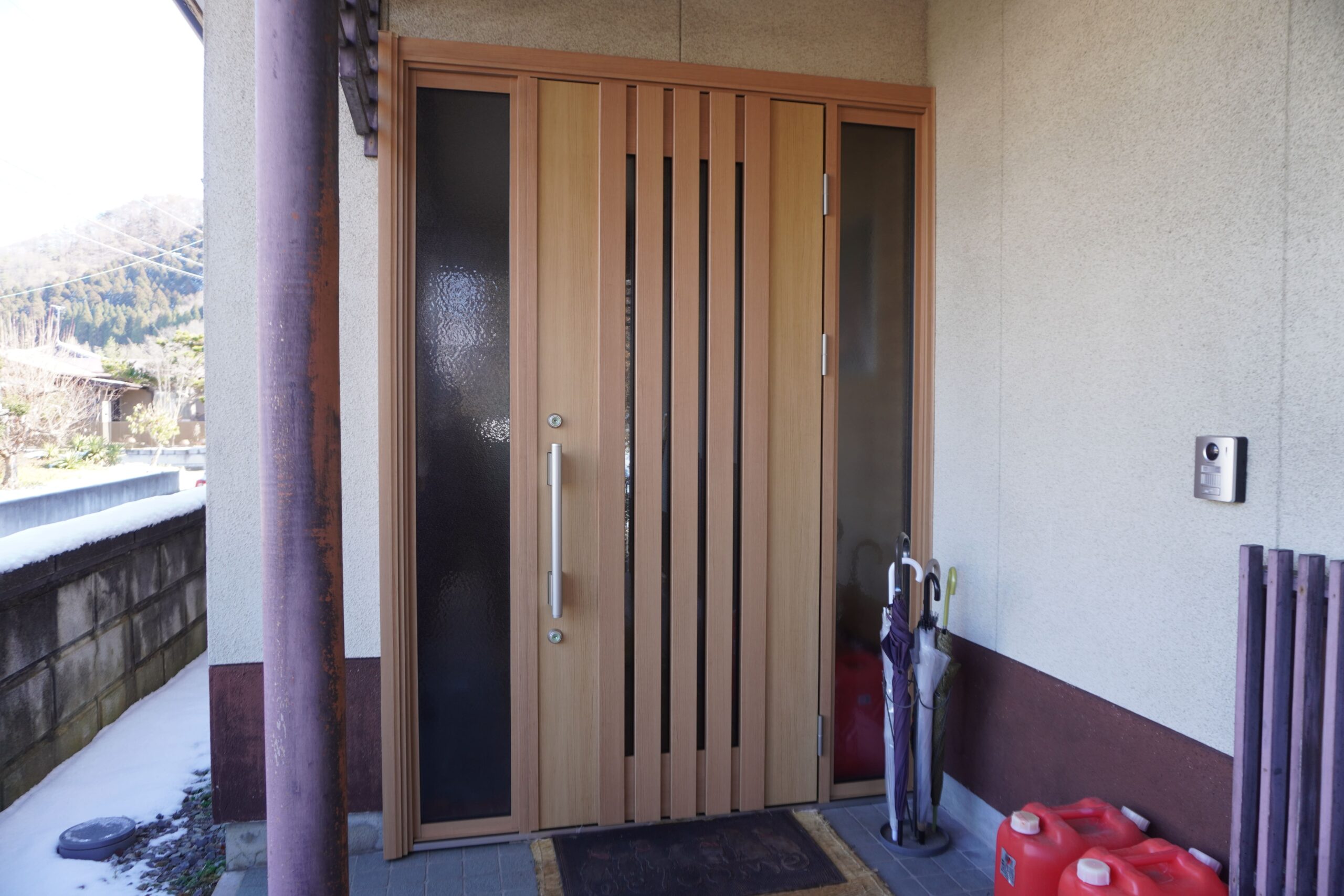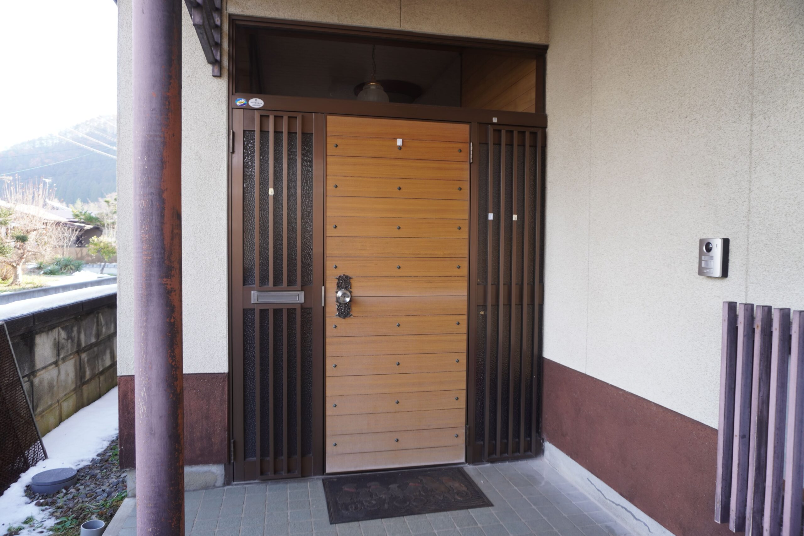 - 木目調のC03N型は、和風・洋風問わず調和するデザインです。両袖FIXにより、ドアを閉めたままでも明るさを確保でき、玄関ホールの快適性が向上しました。