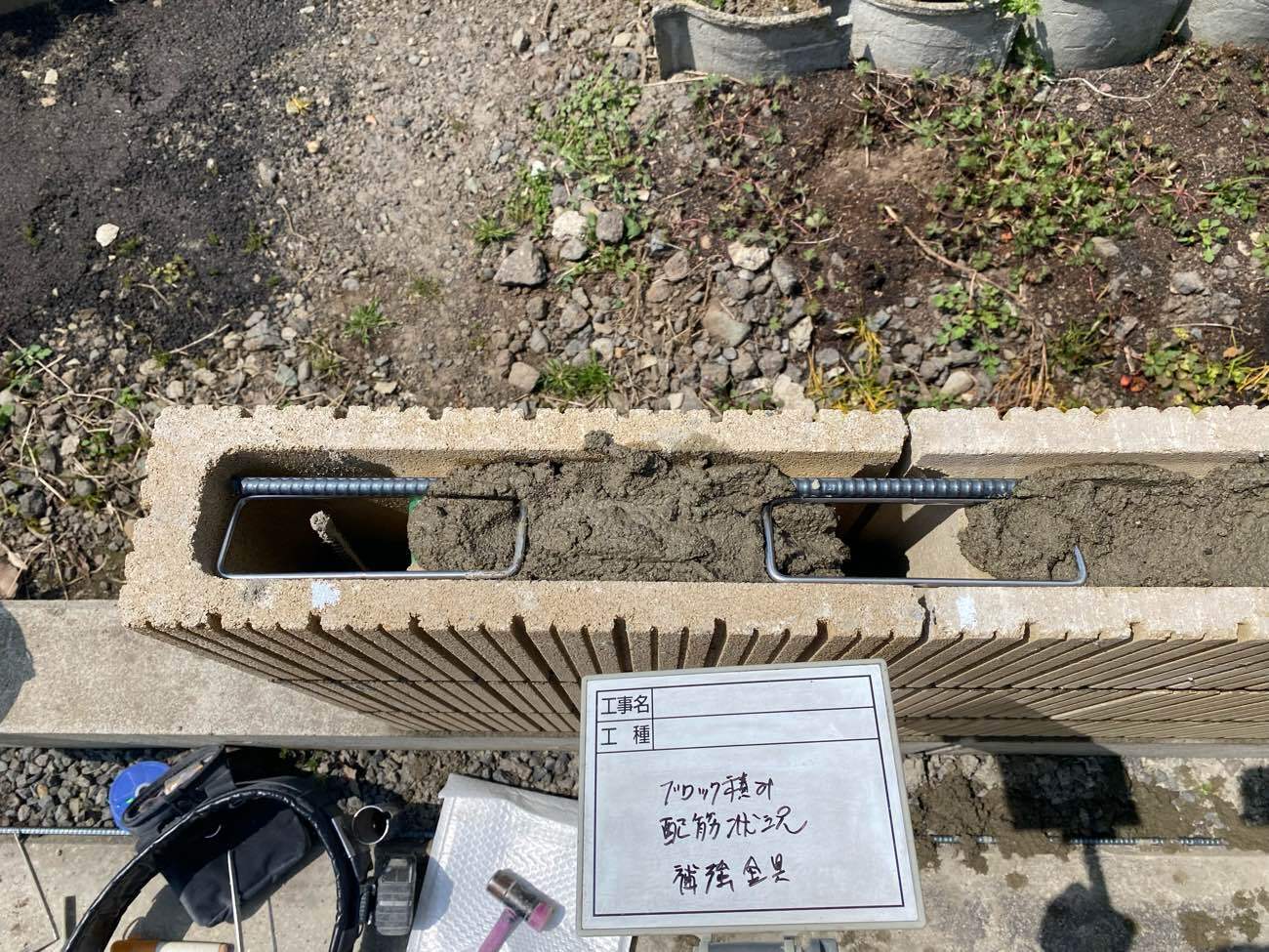 マチダのブロックGライト12は通常の化粧ブロックよりもモルタルを多く充填でき、塀の耐久性を上げることが出来ます。さらに今回は、オプションの「あんしん補強金具」を採用して、一層強度を上げています。