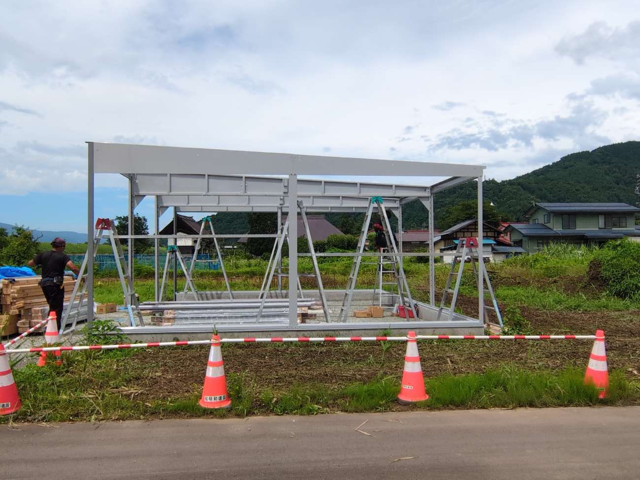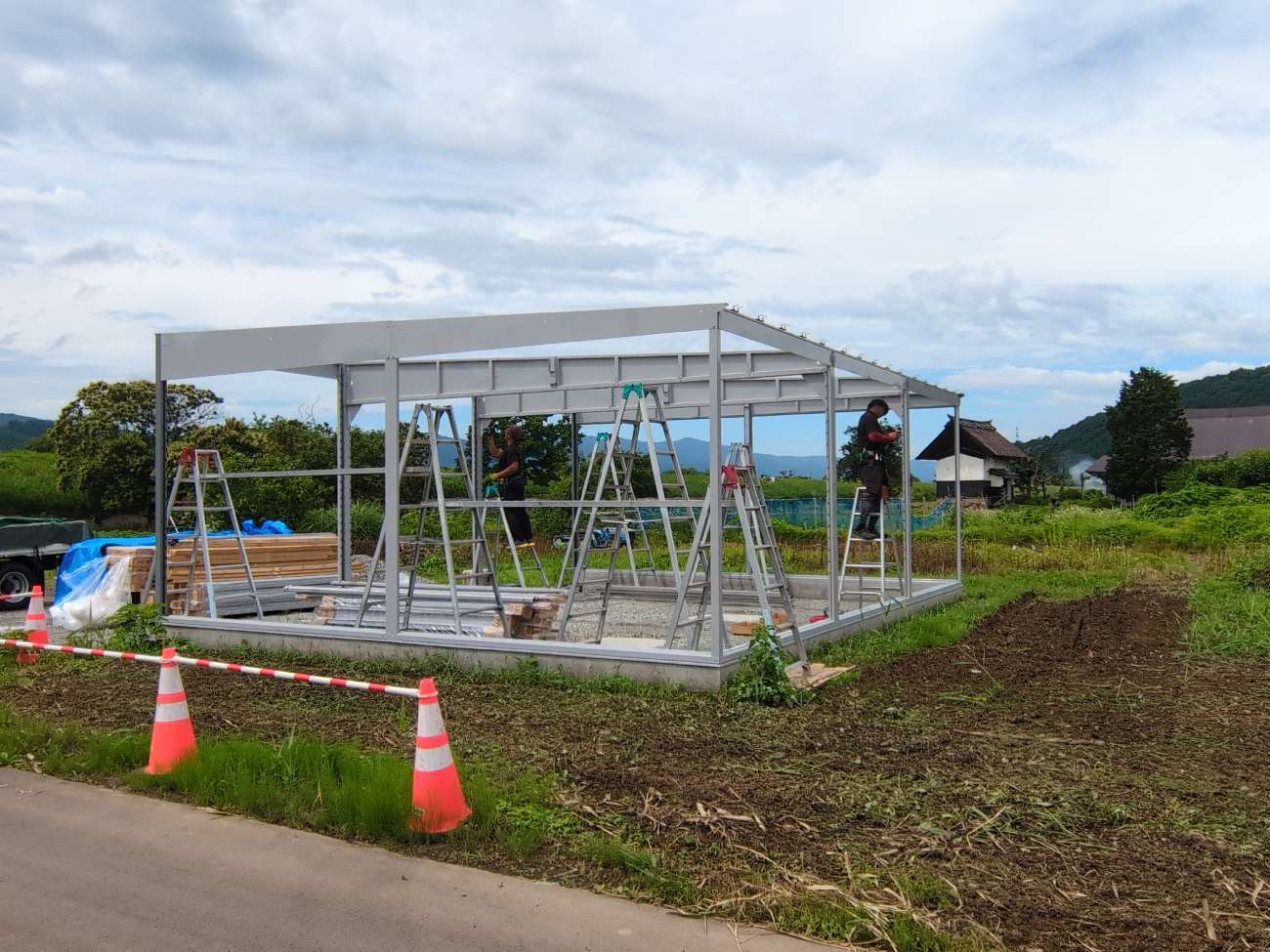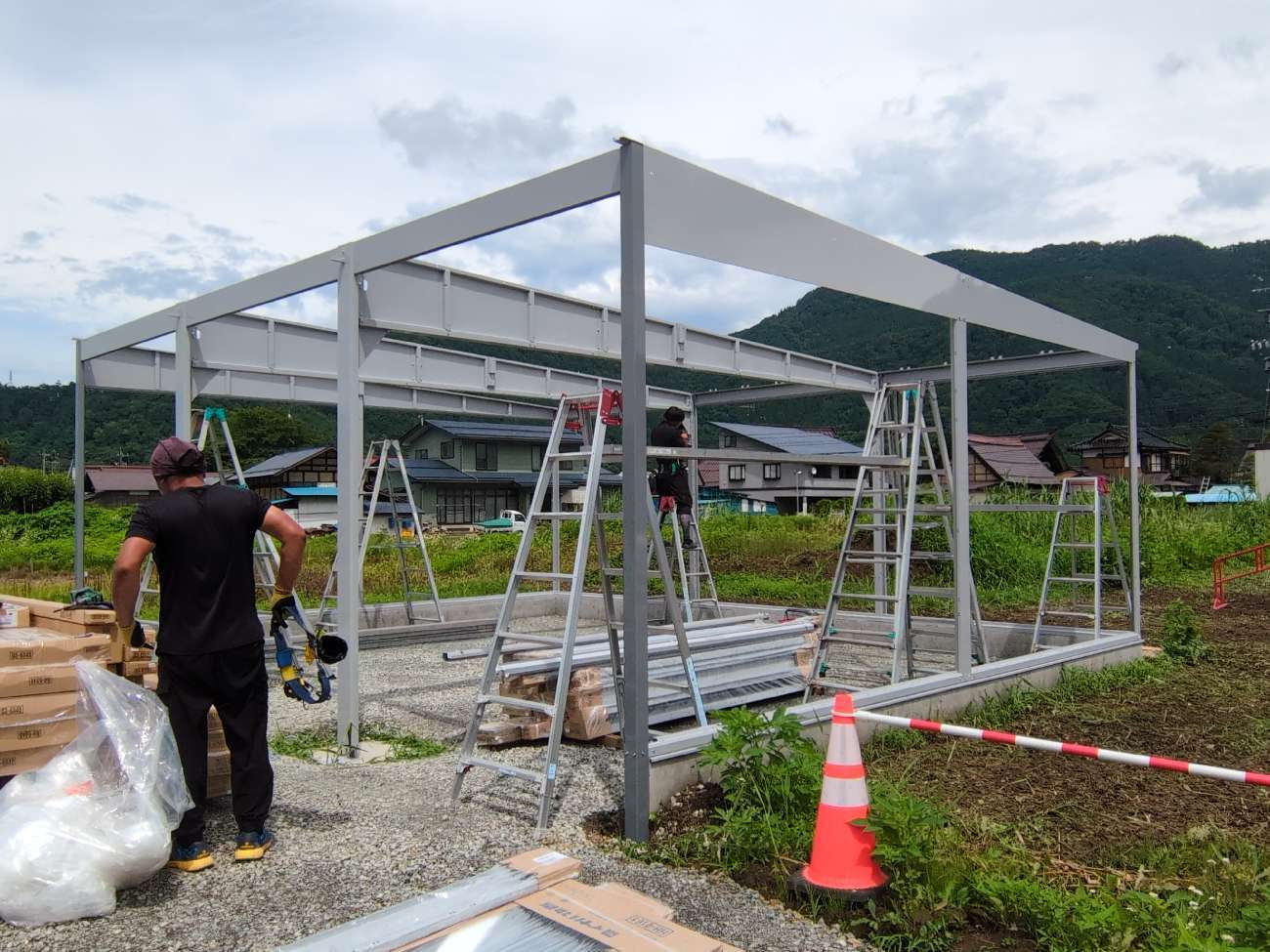 最初にガレージの基礎工事をして、しっかりした基礎を構築した上でガレージを組み立てていきます。3台用ともなれば、必要な部材の数も多いです。骨組みを組み立てていきます。